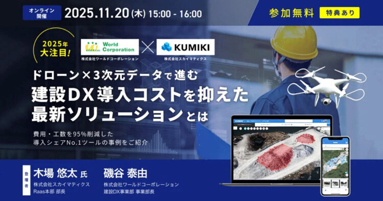 2025年11月20日(木)15時よりワールドコーポレーション社との共催ウェビナーを開催します。DX、ICT施工に取り組んでいる方、これから取り組みたいと考えている方は是非参考にしていただければと思います。ぜひお気軽にご参加ください。