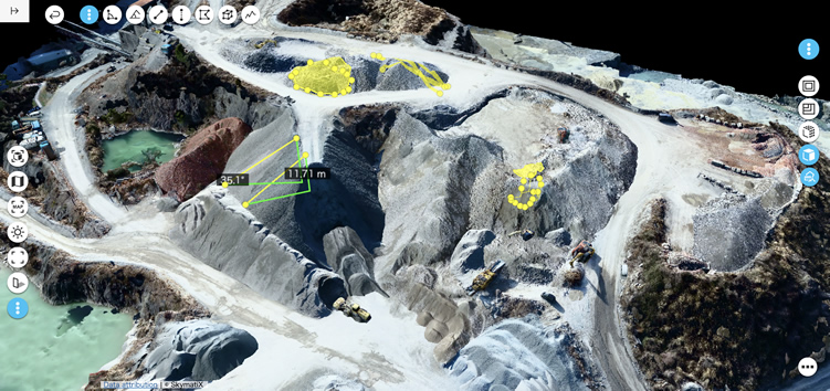 ドローン測量の民主化に向け、スカイマティクスがこだわったのがUI(ユーザーインタフェース)/UX(ユーザーエクスペリエンス)の改善だ。その1つが「計測/解析」機能。オルソ画像で距離や面積を計測する「簡易計測」や、点群データで体積や角度や断面などを計測する「点群計測」など、従来は専門知識が必要とされた作業を誰でも簡単に扱えるようにした。その操作は、画面上に表示される各機能に対応したアイコンを選択した後、計測対象をクリックするだけという簡易さだ。